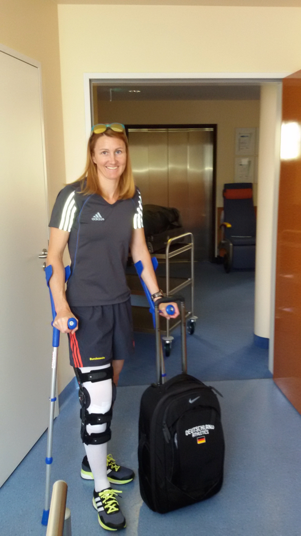 Ich wusste immer, ich werde wieder zurück kommen. Das wann war ungewiss, aber mein Wille war vom ersten Tag an da und ans Aufhören habe ich nie gedacht. Nach 2 Wochen "Couch-Potato" bin ich in den Zug nach Mainz gestiegen, wurde von Freunden abgeholt und versorgt und bin dann 2 Tage später mit dem Zug weiter nach Warendorf zur stationären Reha ins Sportmedizinische Institut der Bundeswehr gefahren. Jeden Tag war ich dankbar über meine Gesundheit in all den Jahren als Sportlerin. Denn wie umständlich alles ist, wenn man mit 2 Gehhilfen unterwegs ist und einfach nur etwas von A nach B tragen oder eine Kleinigkeit aus dem Kühlschrank holen wollte, merkte ich in dieser Zeit sehr.