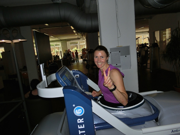 Die ersten Gehversuche ohne Gehhilfen waren auf dem ALTER-G. Hier kann man wie im Weltraum mit Körpergewichtsentlastung trainieren. Das ist ideal für die ersten Schritte nach Operationen oder Verletzungen. So kann durch Bewegung der Stoffwechsel angekurbelt werden und durch die Gewichtsentlastung ist es möglich, eine gleichmäßige Gangart einzuprogrammieren. Durch das Gehen mit Gehhilfen und die dadurch resultierende Fehlhaltung sind bei mir natürlich muskuläre Dysbalancen nicht nur im Knie sondern im ganzen Körper entstanden.