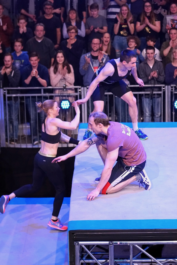 Einen ganz herzlichen Dank möchte ich an meine Team-Kollegen Jonas und Colin aussprechen und auch an das Wrestling-Team Dambach für die tolle Unterstützung! 70 Fans aus Dambach sind mit einem Bus angereist und haben uns unterstützt. Für Jonas und mich war es der erste Einsatz bei Ninja Warrior Germany. Colin war bereits einmal im Einzelwettbewerb dabei. Alle Neulinge sind zu Beginn sehr angespannt und nervös. Die Aufzeichnungen dauerten bis spät in die Nacht. Um 0:30 Uhr hatten wir erst unseren letzten Staffel-Lauf. Für uns Athleten ist es sehr schwer, dass die Hindernisse erst am Aufzeichnungstag bekannt gegeben werden und wir nur 15min Zeit zum Ausprobieren haben. In dieser Zeit kann man natürlich nicht jedes Hindernis mehrfach testen, sondern muss sich seine Kräfte gut einteilen für die Show.